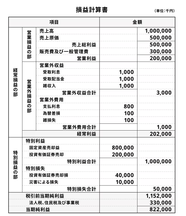 会社が「ある一定期間」にどれだけの収益を上げ、いくらの費用(コスト)をかけ、最終的にいくらの利益(儲け)が出たかを示す報告書です。財務三表の一つで、売上高から5つの利益(売上総、営業、経常、税引前当期純、当期純)のプロセスを記載し、本業の収益力や経営の効率性を分析する指標として重視されます。