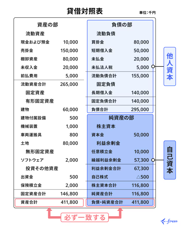 決算日時点で企業が保有する資産、負債、純資産の一覧表です。「左側(借方)の資産=右側(貸方)の負債+純資産」が必ず一致(バランス)する形式で、企業の財政状態(資金調達と運用の実態)を明らかにする財務三表の一つです。